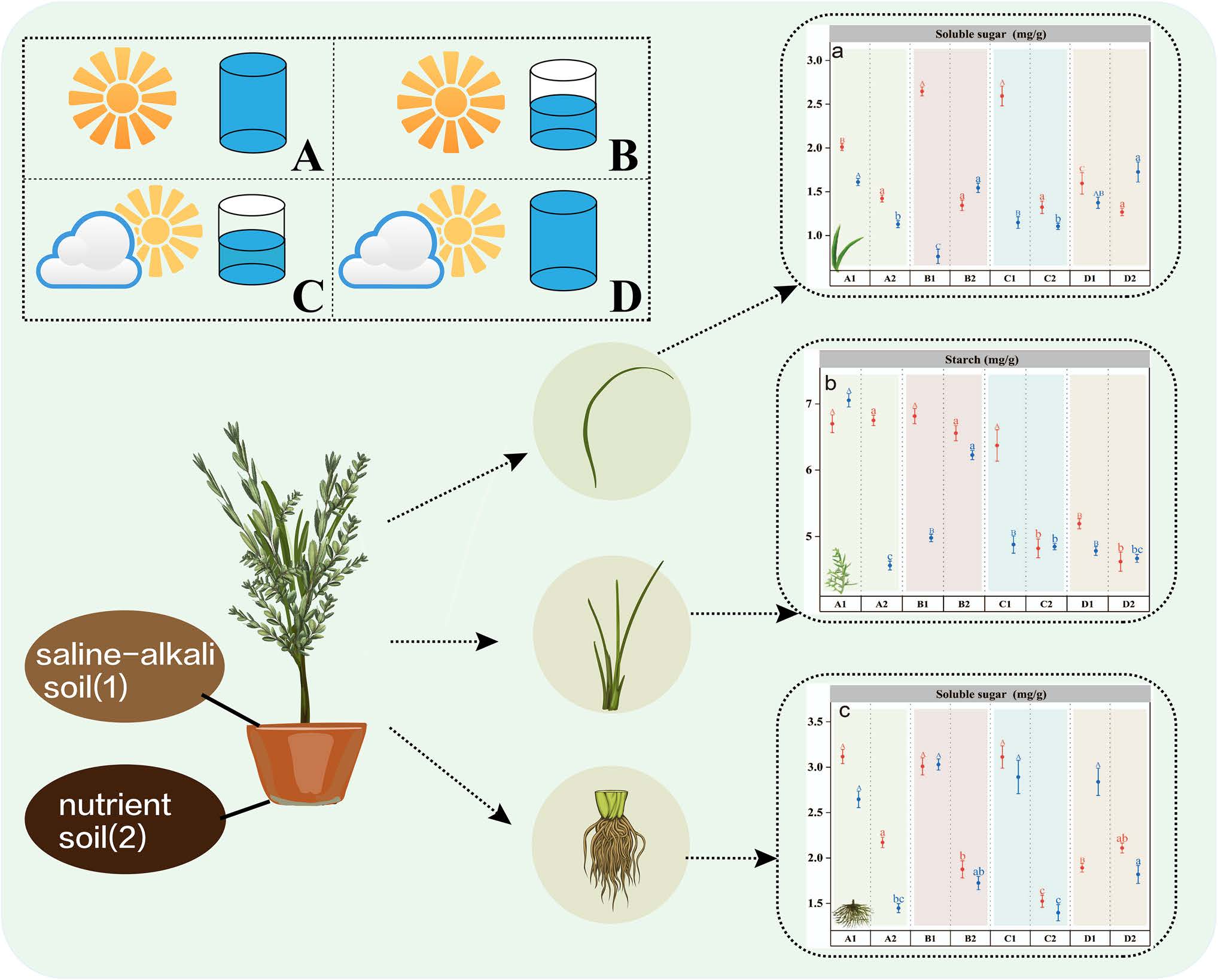 近日,我校資源與環(huán)境工程學(xué)院吳楠教授課題組在學(xué)術(shù)期刊《Journal of Plant Growth Regulation》(JCR Q1,IF=4.4)上發(fā)表題為“The Effects of Light and Water Level on the Non-Structural Carbohydrates of Suaeda Salsa”的研究性論文。該研究首次系統(tǒng)揭示了不同光照與水位對鹽生植物鹽地堿蓬碳分配策略的交互影響,為鹽堿地生態(tài)修復(fù)與可持續(xù)利用提供了重要理論依據(jù)。研究發(fā)現(xiàn),在高水位條件下,鹽地堿蓬葉片與根部淀粉含量顯著上升,表現(xiàn)出獨(dú)特的“雙重碳儲存策略”,以應(yīng)對低氧脅迫;而在低水位條件下,植物則通過增加葉片可溶性糖含量來維持滲透調(diào)節(jié)。不同光照條件下非結(jié)構(gòu)性碳水化合物的變化也反映了植物對光照不足的適應(yīng)性調(diào)整。這些發(fā)現(xiàn)系統(tǒng)闡明了鹽地堿蓬在復(fù)合脅迫下的生態(tài)適應(yīng)機(jī)制。