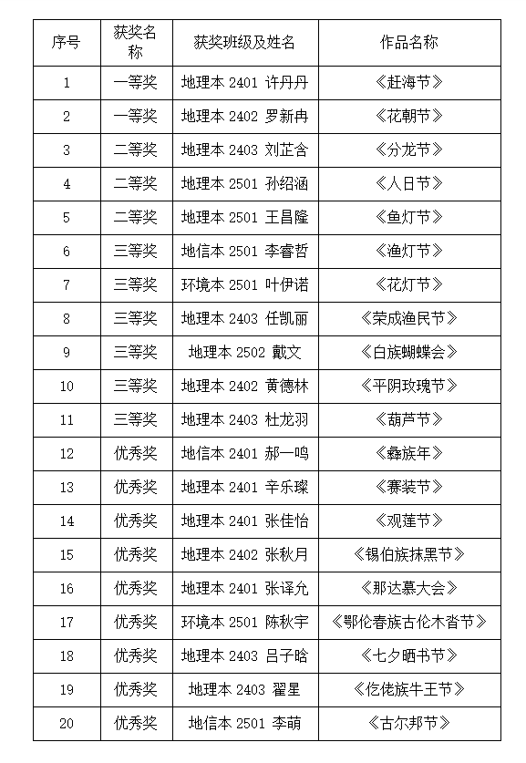為挖掘中國(guó)小眾節(jié)日的趣味內(nèi)核與文化價(jià)值,我院于11月10日成功舉辦以“日歷‘奇葩圖鑒’--小眾節(jié)日分享”為主題的“資環(huán)小郵箱”活動(dòng)。本次活動(dòng)自從舉辦以來(lái),得到了同學(xué)們的積極響應(yīng)與廣泛參與。經(jīng)過(guò)激烈角逐,共評(píng)選出一等獎(jiǎng)2名、二等獎(jiǎng)3名、三等獎(jiǎng)6名以及優(yōu)秀獎(jiǎng)9名。獲獎(jiǎng)名單公示如下: