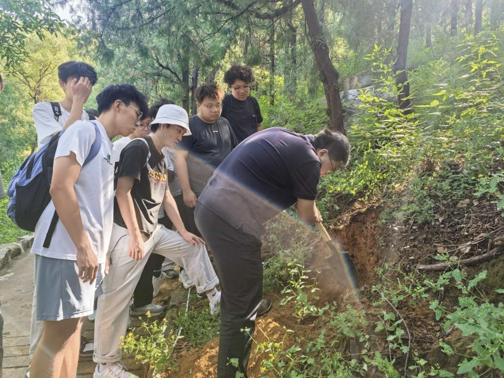 第三天的實習圍繞土壤剖面與植被調查展開。曾琳老師介紹,普照寺區(qū)域分布的是典型棕壤,其母質為變質巖,土壤酸性較強,且淋溶作用顯著。學生在指導下使用工具挖掘約50厘米深的剖面,清晰觀察到自下而上的各層結構:基巖、母質層、淀積層、淋溶層、腐殖質層及枯枝落葉層,并完成樣品采集。在植被調查環(huán)節(jié),李國慶老師指導學生開展20×20米樣方調查,記錄植物種類、數(shù)量、高度及蓋度等指標,為研究群落特征和生態(tài)環(huán)境提供基礎數(shù)據(jù)。